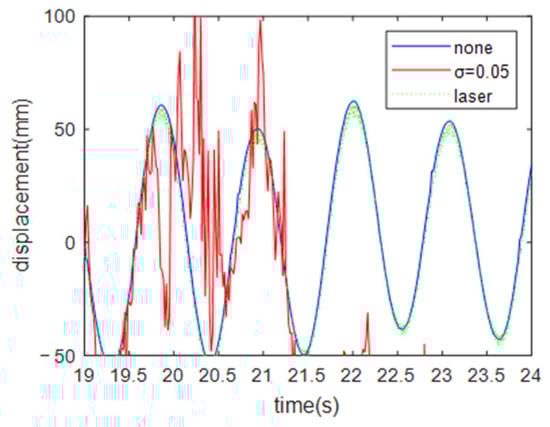 As shown in Figure 7, under the condition of the applied white noise of σ = 0.05, the displacement analysis curve and the laser measurement curve showed a large difference. The average error reaches 46 mm, and the mean square error reaches 1786 mm. Thus, the recognition error increased substantially in the presence of both noise and non-uniform illumination.