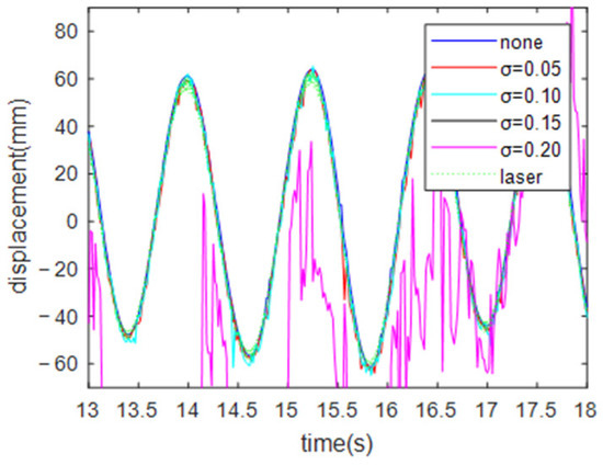 As shown in Figure 12, when the condition of asymmetric illumination and white noise less than σ = 0.15 was applied, the displacement analysis curve of the combined noise-resistance method fit well with the laser measurement curve, which could better reflect the actual displacement situation and had better noise immunity and robustness. Under the condition of white noise of σ = 0.2, the displacement analysis curve of the combined noise-resistance method had a large difference from the laser measurement curve.