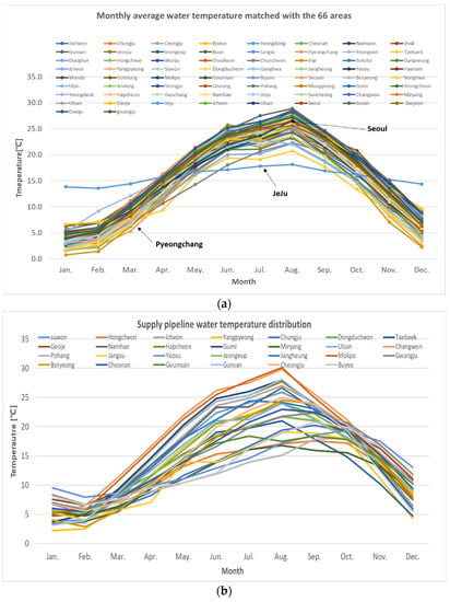 Unlike river water heat sources, pipeline water data cannot be obtained from a water environment information system in the form of a database. Pipeline water data are sporadically collected by local governments; however, data of all regions are not managed. Therefore, data of only 27 regions could be secured from the Water Resources Corporation for 5 years (2015–2020).