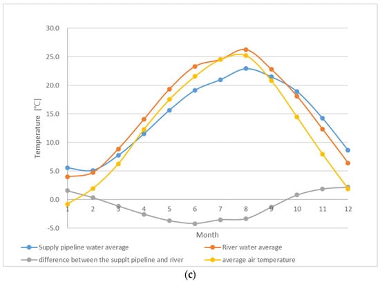 Hydrothermal sources of (a) river water, (b) pipeline water, and (c) monthly mean temperature of pipeline water, river water, and standard meteorological data.