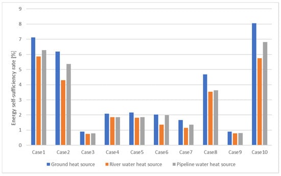 Comparison of ground, river water, and pipeline water heat source self-sufficiency rates for each case.
