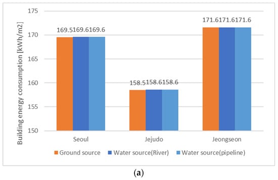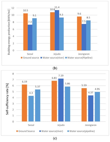 There are marginal differences in building energy consumption depending on the renewable energy production equipment, with only regional differences significant because building energy demand is the energy required by the building to keep the interior comfortable under specific conditions (such as temperature, insulation, and airtightness) and that building energy consumption is also building-specific energy demand that includes the energy required by facilities and equipment. As such, with the performance of buildings remaining similar and only the regional standard meteorological data changing, building energy demand and consumption vary only according to regional conditions. Figure 4 shows the regional comparison of ground-source heat pumps and water-source heat pumps for building energy consumption, production amd self-sufficiency rate. Figure 4b shows production comparison graphs of each region; unlike in the above 10 case comparisons, the river water sources in Jeju show higher production than those in other regions. In Figure 2, this is expressed by the smooth temperature variations around 15 °C in the Jeju-do River water throughout the year, which seems to influence the performance of river water heat pumps. Figure 4c shows the self-reliant rate comparison graph. As the self-reliant rate is determined by the energy production volume, with the consumption maintained at the same level, GHSPs are advantageous in areas exposed to abrupt water heat source temperature changes, such as Seoul or Jeongseon, whereas WSHPs are more advantageous in areas with smooth water temperature variations, such as Jeju-do.