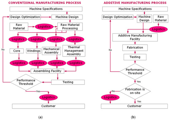Figure 1 shows the flowcharts of conventional manufacturing and additive manufacturing processes. It lists the advantages and solutions that additive manufacturing would provide in the field of manufacturing of electrical machines, provided that further research and methodological development is enhanced. The full potential of the mentioned solutions lacks the deeper and universal knowledge, development strategies, and matured methodologies, making it, today, at best, a trial-and-error-based approach.