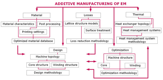 In conclusion, additive manufacturing provides new possibilities as an emerging agile manufacturing industrial branch, which is nonexistent in the case of the electrical machine manufacturing industry. The biggest challenge providing enough developed methods and methodologies in all stages of electrical machine design, and to find typical appropriate solutions that can later be standardized. Only through these steps, will the technology be able to reach a readiness level where it can be utilized to its full potential and be usable for engineers in industry, in order to produce novel, efficient, and reliable 3D printed electrical machines. The flow, intended to tackle gaps in the existing research, is presented in Figure 2.