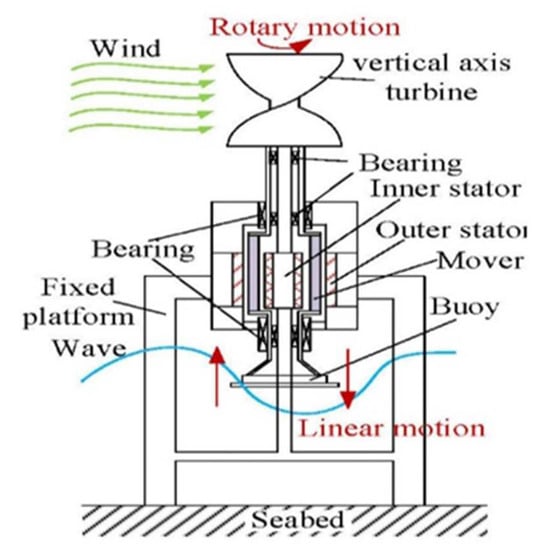 A novel joint wind-wave energy (JWWE) power conversion system is proposed in [46], where a dual-stator linear and rotary permanent magnet generator (DSLRPMG) is deployed to convert the wave and wind energy, respectively. The joint offshore wind and wave energy power conversion is directly employed to convert mechanical energy to electrical energy. The DSLRPMG system can be deduced by using the vector control method. The flux and power decoupling method are proposed, as shown in Figure 4, where the linear and rotary motions of the DSLRPMG magnetic field presents strong coupling effects. Since the back electromotive force and flux linkage are both sinusoidal, by ignoring the magnetic saturation, hysteresis loss and influence of the temperature, the linear motion and rotary motion are expressed by the equations below [46].