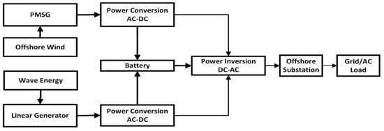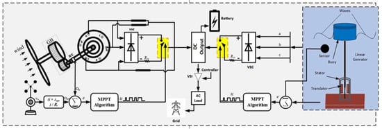 Figure 8 represents a feasible arrangement of conversion framework with an OWT and a WEC with DC energy storage. This arrangement presents AC-DC and DC-AC power conversion with reference to wave energy generation and battery storage units, respectively. The power conversion is carried out by VSC and power inversion is carried out by VSI. Such topologies could improve the systems efficiency of the system in relations of output-power and co-generation cost.