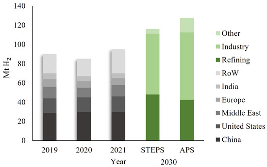Hydrogen demand by sector and by region according to [45], 2019–2030.