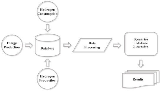 The rapidly increasing population, pushed by the global economy, has dramatically increased the energy demand [1,2,3]. However, economic energy needs are still based on fossil fuels (namely coal, natural gas, and oil). According to International Energy Agency (IEA), in 2018, the global total energy supply of fossil fuels reached over 80%. Electricity and heat accounted, respectively, for 19.31% and 3.03% of energy consumption; however, the primary energy sources for both are fossil fuels [4]. Considering the climate change scenario and the economy’s decarbonization policies, in 2019, the European Commission published the European Green Pact (EGP) [5]; the document presents policy efforts to achieve zero net greenhouse gas emissions by 2030–2050 timeframe objectives. State members are called to promote EGP, but the current state of the hydrogen economy, primarily green hydrogen, in global and individual countries, is only beginning. Due to current energy problems and volatile prices for hydrocarbon resources, transport, industry, and electricity are the focus. Considering the number of hydrogen syntheses and types, it is necessary to focus resources on the priority: green hydrogen. This work proposes an energy transition study for Portugal considering green hydrogen produced by electrolysis powered by renewable energy sources (RES).