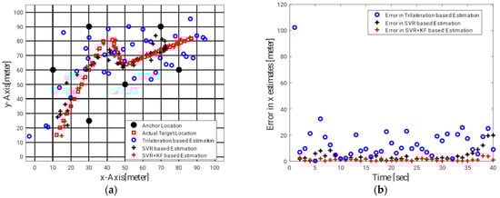 As discussed in Section 4, the target was assumed to take 40 locations in the given indoor environment during its motion. Figure 4b,c illustrate the localization (location estimation) error for each of these 40 target locations with trilateration, SVR, and SVR+KF for the x-coordinate and y-coordinate for each target, respectively. To obtain the overall 2-D localization performance with trilateration for the proposed SVR-based models, the location estimation errors for the x and y coordinates were averaged to obtain the average localization error. The values of the average localization errors for 40 target positions are shown in Figure 4d. From Figure 4a, it can be seen that the estimations achieved with the trilateration scheme were far away from the corresponding real target positions compared with those of the proposed SVR models. Few location estimates obtained with plain SVR models without KF are close to the corresponding real target positions; however, the remaining estimates are away from the actual target location by 2 to 5 m. Most of the estimates given by the proposed SVR+KF model coincided with the corresponding real target positions. The individual location estimation error for the x-coordinate and y-coordinate corresponding to the actual target locations can be observed in Figure 4c and Figure 4d, respectively. The RMSE values and average position estimation errors were highest, moderate and lowest with trilateration, and the proposed SVR-based schemes, respectively, in the case of linear kernel (case I) (See Table 4). The average RMSE with the SVR-based schemes for the linear kernel function case decreased by 68% and 99%, respectively, against the trilateration-based localization scheme. The average position estimation error with SVR and SVR+KF for the linear kernel function case decreased by approximately 66% and 91%, respectively, as compared with that of the trilateration-based localization scheme. Thus, both SVR-based schemes outperformed the traditional trilateration-based scheme using RSSI measurements.