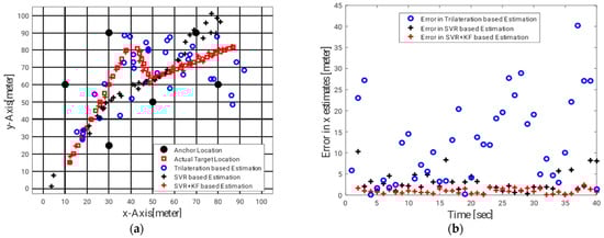 It is quite logical that the location estimates obtained with any SVR-based model with different kernel functions will have varying performance. Thus, it would be quite interesting to check the impact of different kernel functions on indoor target localization with the proposed SVR-based framework. In this work, we used four kernel functions with the proposed SVR scheme, namely, linear, RBF, polynomial, and sigmoid. These kernel functions were tested separately for the same system setup in case I to case IV. Case I to case IV evaluated the impact of linear, polynomial, RBF, and sigmoid kernel functions on the target localization with the proposed SVR-based model, respectively. The results of case I are provided in Figure 4 and Table 4. In order to differentiate the real target trajectory and location estimations obtained using trilateration, SVR, and SVR+KF, we used “red square”, “blue circle”, “black plus”, and “red plus” markers, respectively, in Figure 4 (case I). The same color markers were used in the rest of the cases considered in this work. To assess the localization accuracy of trilateration and the proposed SVR-based schemes, the RMSE values for x-coordinate estimation and y-coordinate estimation along with average RMSE values and average localization errors were computed for each of the four cases using Equation (16) to Equation (19), respectively. Figure 4a shows the actual target trajectory in the given indoor environment and the estimated trajectories with all the considered localization techniques.