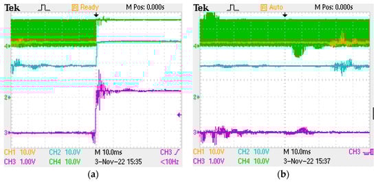 The waveform when the short-circuit fault of S3 occurs is shown in Figure 20a. CH1 is the output voltage of the converter. CH2 is the flying capacitor voltage. CH3 is the trigger signal. CH4 is the driver signal of the power switch S3. The waveform of the three-level mode before the fault occurs is shown in Figure 20b. The waveform during the fault is shown in Figure 20c. It can be seen that the output voltage is uninterruptible and the flying capacitor voltage is regulated from 16 V to 0. The waveform of the two-level mode after the fault occurs is shown in Figure 20d. The waveform when the short-circuit fault of S4 occurs is shown in Figure 21a. The waveform before an S4 fault is shown in Figure 21b. The waveform during the fault is shown in Figure 21c. It can be seen that the output voltage is uninterruptible and the flying capacitor voltage is regulated from 16 V to 32 V. After the S4 fault, the waveform is shown in Figure 21d.