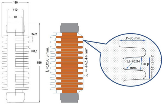 The design variables were substituted into Equation (1) for P.F. and Equation (2) for C.F. So, the profile factor (P.F.) is equal to 1.482, which is more than 0.8 for the level of pollution in 1 and 2 (light to medium pollution areas). Moreover, the creepage factor (C.F.) is equal to 2.374, which is less than 3.5 for the level of pollution in 1 and 2 (light to medium pollution areas).