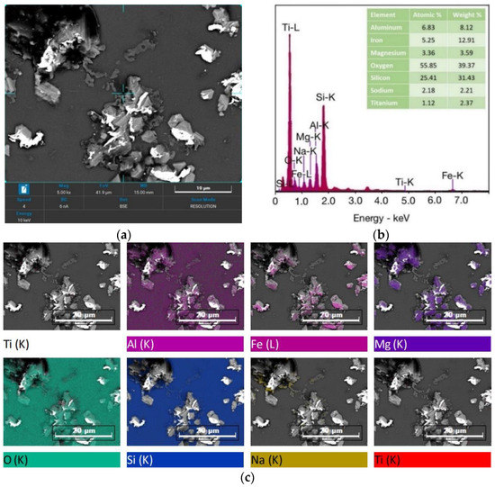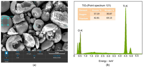 The shape of nano-TiO2 is also shown in Figure 3a, where a quasi-spherical form is often seen. There could be some nano-TiO2 agglomerates present since no dispersant was utilised. Electron dispersive X-ray spectroscopy (EDS) was used to confirm the chemical composition of nano-TiO2, which is shown in Figure 3b. The properties of the nanoparticles employed in this work are listed in Table 1 [16]. Detailed properties of nano-TiO2 are specified by the manufacturer [16]. Titanium dioxide (titania) nanopowder, anatase. Specification: 99.9%; anatase; primary particle size ~40 nm (from SEM and BET surface area); BET multi-point specific surface area (SSA) >40 m2/g; spray-dry agglomerated to ~50 microns for easy handling.