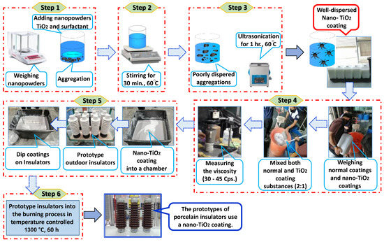 A thin nano-TiO2 layer was applied to the surface of outdoor insulators via the development of an insulator nano-TiO2 coating method for surface modification. The process includes six steps. The nanoparticles are mixed with deionized water. The nanoparticles must be weighed on a digital balance, and the particle content required is 0.1% wt of deionized water. TiO2 nanoparticles (nano-TiO2) combined with deionized water and a surfactant. The surfactants are organic compounds, which consist of two parts: the hydrophilic group and the hydrophobic group. Two different phases can come together. When a small amount of surfactant is added, two phases can be combined to form a single phase. In this research, a surfactant type, TERGITOL™ NP-6 Surfactant (Nonylphenol Ethoxylate) [21], which has properties as a non-ionic surfactant, was selected to be used as an ingredient in the preparation of nano-TiO2 coatings for outdoor porcelain insulators. Then, it is placed in the stirrer for 30 min at 60 °C, or until it diffuses, and put in the high-frequency ultrasonicator at 60 °C for 1 h to ensure the homogeneity of the liquids, as shown in Figure 5. The step, as shown in Figure 5, begins with weighing the normal coatings and nano-TiO2 coatings at the prescribed amount (a weight ratio of 2:1 between the normal coatings and nano-TiO2 coatings). The next process involves mixing two substances, including measuring, and controlling the coating viscosity at 30–45 Cps. and waiting for the next process. After that, the nano-TiO2 coatings are put into a chamber containing the coatings. The formed prototype insulator is then put on an automatic coating machine to process the coating. Lastly, the prototype insulator is put into a temperature-controlled kiln under control at 1300 °C for 60 h.