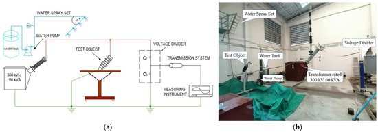 The experimental setup for testing the critical-flashover voltage for a lightning impulse in both dry and polluted conditions is shown in Figure 8 and Figure 9. The impulse voltage generator, whose rated voltage is 400 kV and 40 kJ under both normal and contaminated circumstances based on TIS 1077-2535 (1992) [25], TIS 2623-2560 (2017), and IEC 60507 (2013) [26], is used to acquire test power. The primary capacitor is charged to the desired voltage. The circuit is then automatically initiated by the spark gap to provide a positive polarity lightning discharge voltage of 1.2/50 μs. The experiment uses the up-and-down test methodology. A test was conducted in order to determine how effectively conventional porcelain insulators can tolerate impulses at both positive and negative polarities and in unclean circumstances. Furthermore, the surface of the specimens is polluted using test techniques on pollution flashover the suspension of sodium chloride and kieselguhr, which, respectively, imitate electric and inert materials. Based on the results of [27,28,29], the relationship between the critical flashover voltage representations of the electrical withstand value and the equivalent salt deposit density (ESDD) values is recommended as a contamination severity criterion for each case, as shown in Equation (4):
