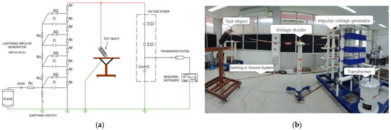 The experimental circuit of the lightning impulse critical-flashover voltage under normal condition test.(a) The circuit diagram on the lightning impulse critical-flashover voltage test; (b) The test circuit set-up on the lightning impulse critical-flashover voltage test.