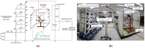 The experimental circuit of the lightning impulse critical-flashover voltage under contaminated condition test. (a) The circuit diagram on the lightning impulse critical-flashover voltage test; (b) The test circuit set-up on the lightning impulse critical-flashover voltage test.