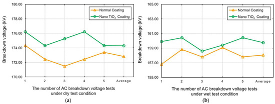 Test results of low-frequency flashover performances. (a) The low-frequency flashover performances under dry test condition; (b) The low-frequency flashover performances under wet test condition.