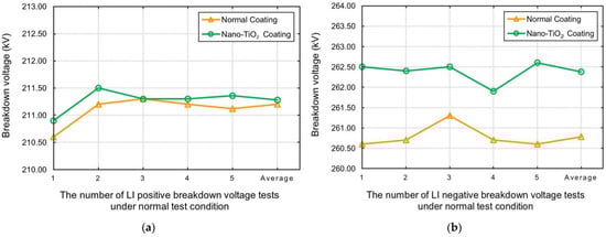 Test results of critical impulse flashover voltage value under normal test conditions are as follows. (a) The lightning impulse critical-flashover voltage performance under positive polarity testing; (b) The lightning impulse critical-flashover voltage performance under negative polarity testing.
