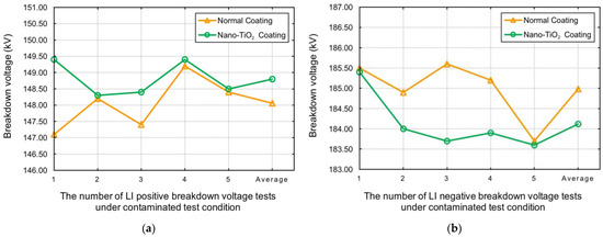 A comparison of the critical impulse flashover voltage is illustrated in Table 3. In Figure 11, under normal test conditions, both positive and negative lightning impulses, the nano-TiO2 coated insulators had a slight increase in dielectric strength compared to traditional coated insulators. In the same way, Figure 12 shows the critical impulse flashover voltage value under contaminated test conditions. When the nano-TiO2 coating was added to the porcelain insulators, there was only a slight improvement in the changes under positive polarity testing, and in the negative polarity testing, there was no significant change in the characteristics of the lightning impulse critical-flashover voltage. The electrical performance test results are less than 2%, according to the results. It may be because the nano-TiO2 content is so low (only 0.1 wt.%) that it does not show a clear effect on the electrical properties of the coated insulators with improved coating as much as it should. In the future, we may add more nano-TiO2 to show higher electrical values. Additionally, it is well known that under both positive and negative lightning impulses, the distribution of the electric field on the insulator’s surface is not uniform. The accumulation and growth of space charges would greatly distort the electric field across the air gap and reduce the flashover voltage [13,33]. Undoubtedly, one of the most effective ways to reduce the likelihood that charges will accumulate on the surface of an insulator is to decrease the surface resistivity [34]. Insulators are coated with nano-TiO2 to make the insulator surface diffuse the electric field and thus increase the lightning impulse voltage. Contrarily, the surface conductance of the TiO2-coated insulator is higher than that of the uncoated one, which might lead to an increase in leakage current and a decrease in flashover voltage. During testing, the U50% stays pretty much the same because these two opposing effects often cancel each other out [13].