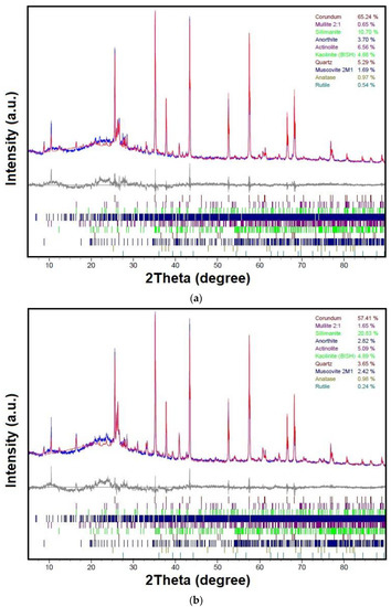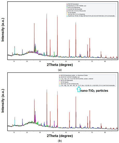 Rietveld refinement plots. (a) Rietveld refinement pattern of a normal porcelain insulator prototype; (b) Rietveld refinement pattern of a nano-TiO2 coated porcelain insulator prototype.