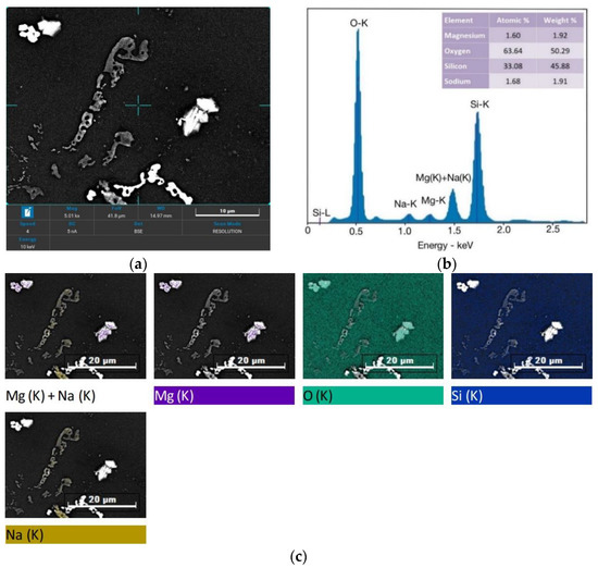 In a glassy matrix with a consistent distribution of quasi-spherical pores, coarse quartz grains with variable shapes make up a typical siliceous porcelain microstructure. There are noticeable fissures all around the quartz grains. This occurrence is linked to the sample cooling stage after the prototype insulator has been burnt at 1300 °C for 60 h in a temperature-controlled kiln when the quartz grain volume falls by 2% because of the β-α quartz-phase transformation [7,31]. This shift may cause enough strain to cause both the glassy matrix and the quartz grains to crack because of the large difference in thermal expansion between the quartz grains, which have a coefficient of thermal expansion of 23 × 10−6 C−1, and the glassy phase that surrounds them, which has a coefficient of thermal expansion of 3 × 10−6 C−1 (at temperatures between 20 and 700 °C). The size of the quartz particles and the rate at which they cool cause a reduction in the porcelain’s mechanical and dielectric strength [31].