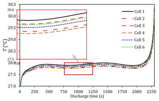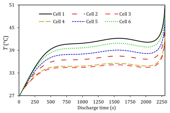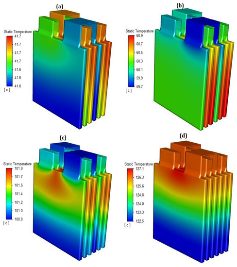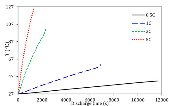 - A benchmark LIB module without any means of cooling exceeded the maximum working temperature with the temperature increased linearly at different discharge rates. At a lower discharge rate of 0.5C, the LIB module temperature exceeded the maximum working temperature by 5 °C when fully depleted. As the discharge rate increased to 3C, the LIB module temperature reached 140 °C, which can cause thermal runaway. In addition, the change in discharge rate affected the distribution of temperature across the LIB module. These results can significantly accelerate the LIB cells capacity degradation and performance, which are in need of an efficient BTMS to control the LIB module within the optimum operating temperature range.