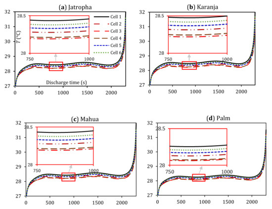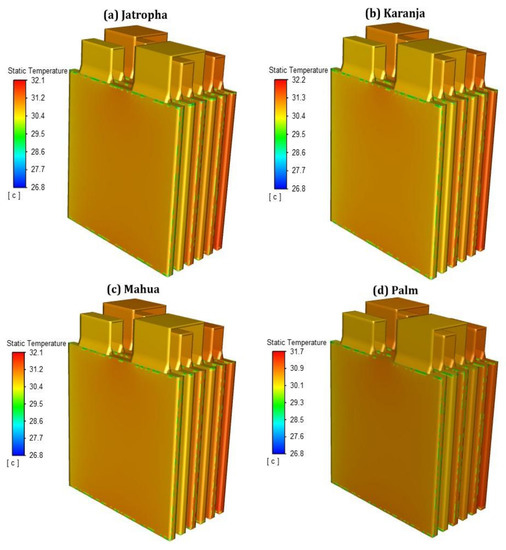 - Biodiesel cooling proved to be a very effective solution for BTMS with all the biodiesels being able to maintain the temperature within the optimum operating temperature range. The best biodiesel out of the four used was palm, as it managed to reduce the LIB module maximum temperature to 31.7 °C at a discharge rate of 3C, ensuring the LIB cells are working to their full potential and maintaining their lifespan. In addition, the low density of palm oil biodiesel (865 kg/m3) decreases the overall weight of the vehicle and the enclosure itself.