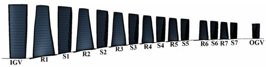 Three rows of variable guide vanes (VGVs), IGV, S1, and S2, were set in this compressor for operating condition adjustment. For ease of distinction, S1 and S2 will be called VGV1 and VGV2, respectively. The turning direction of the VGVs is shown in Figure 2. With an increase in the turning angle, the opening degree of the VGVs decreases gradually. For example, the IGV turning angle being (abbreviated as ) means the IGV is fully open, and means the IGV is almost closed.