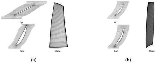 The mesh for the simulation was generated using the NUMECA Autogrid5. The grid topology for blade passage adopts the HOH type. The B2B grid was set to periodically match to ensure that the periodic interface was able to accurately transmit shock wave information. The grid at tip clearance adopted butterfly type. For rotor passages, 109 mesh nodes were set spanwise and 17 mesh nodes in tip clearance. The grid number was about 0.9 million in total. For stator passages, 93 mesh nodes were set spanwise and the grid number was about 0.6 million in total. The minimum spacing on the wall was set such that it was sufficiently small enough to satisfy the condition y+ < 3. The overall mesh is shown in Figure 3, and the local mesh is shown in Figure 4.