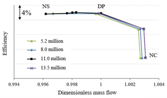 Simulation results for four sets of grids were compared, which grids numbered 5.2 million, 8 million, 11 million, and 13.5 million, respectively. The y+ values of the four sets of grids were all less than 3, which met the requirements of the turbulence model. Figure 5 shows the efficiency curves of these four meshes. It shows that with grid densification, both mass flow and efficiency tend to increase. When the grid number is less than 11 million, the calculation efficiency change is over 0.1%. When the grid number increases to more than 11 million, calculation efficiency changes very little, which is less than 0.05%. In order to ensure the reliability of the calculation results and reduce the calculation cost, 11 million grids were selected for subsequent calculation and analysis.