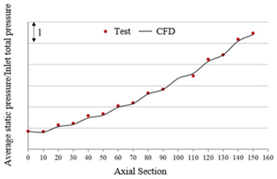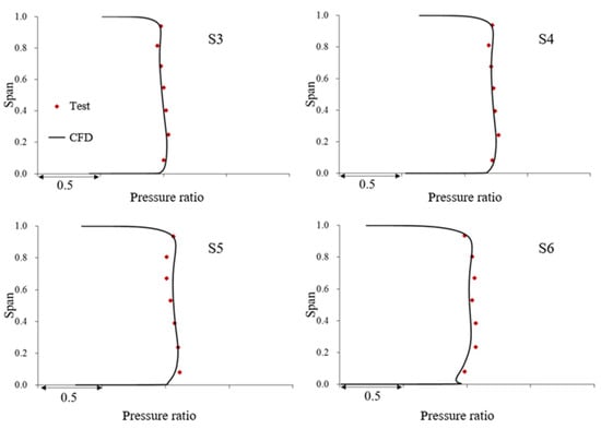 The calculation results were compared with the experimental results. The deviation of mass flow at the design point was about 2.2%, the deviation of pressure ratio was about 0.16%, and the deviation of efficiency was about 0.4%, all within the acceptable range. The pressure distribution between blade rows and the radial distribution of pressure ratio at several cross-sections are shown in Figure 6 and Figure 7, respectively. It is revealed that the calculation results are in good agreement with the experimental results, especially in the mainstream. This shows that the calculation is accurate for the load distribution at all stages and the radial distribution in the blade passages of the compressor. Consequently, the calculation results can accurately simulate the flow in the compressor, which proves the reliability and accuracy of the CFD simulation.