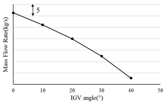 The relationship between IGV turning angle and mass flow is shown in Figure 8. It can be seen that mass flow is not linear with the IGV turning angle. When the IGV turning angle increases by , the mass flow decreases by about 6.4%; when the IGV turning angle increases by , the mass flow decreases by about 35.2%. IGV angle adjustment has a great influence on the mass flow. It is an important method of flow regulation for compressors.