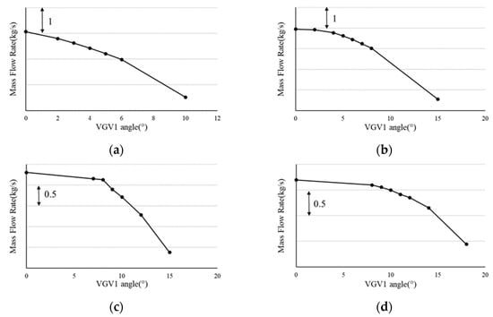 The relationship between mass flow and the VGV1 turning angle. (a) IGV = 10°; (b) IGV = 20°; (c) IGV = 30°; (d) IGV = 40°.