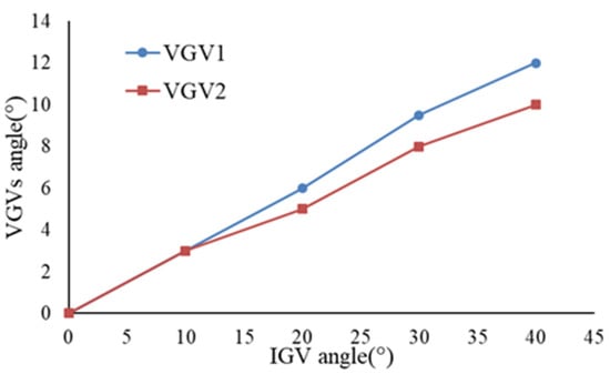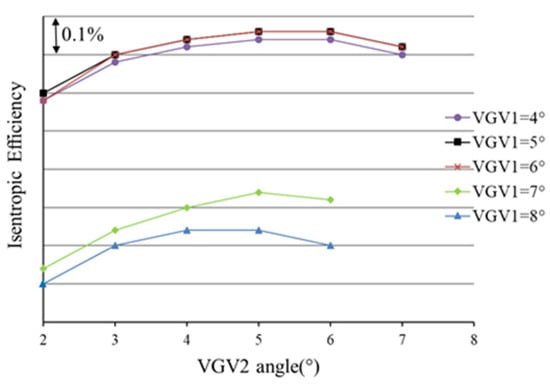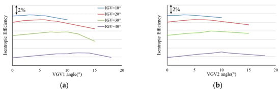 The efficiency varying with VGV turning angle under different IGV opening degrees is shown in Figure 11. For a certain IGV opening degree, with the increase in the VGV1 turning angle, the efficiency increases at first and then decreases. There is an optimal VGV1 angle, which is the same for VGV2. The optimal turning angle of VGVs gradually increases as the IGV opening degree decreases. This is because a smaller VGV opening degree matches the smaller mass flow caused by a smaller IGV opening degree.