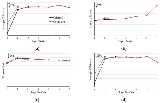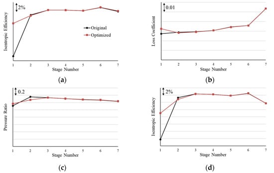 Similar conclusions were drawn when VGV2 adjustment was investigated. Figure 13 shows a comparison between the performance of the original case, , and the optimal case, , when . The efficiency of R1 and R2 increase, about 3% and 1%, respectively, while that of R3 decreases. Moreover, the loss of S2 increases. When it comes to pressure ratio, Stage 1 and Stage 2 rise while Stage 3 falls. As VGV2 is S2 of the compressor, VGV2 adjustment is beneficial to the upstream stage (which does not have to be adjacent), but detrimental to itself and its adjacent downstream stage.