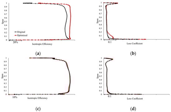 Efficiency spanwise distribution. (a) Efficiency of R1; (b) loss of S1; (c) efficiency of R2; (d) loss of S2.