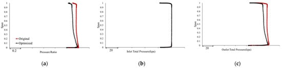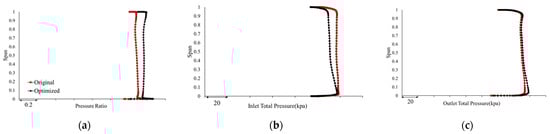 Pressure spanwise distribution of R1. (a) Pressure ratio; (b) inlet total pressure; (c) outlet total pressure.