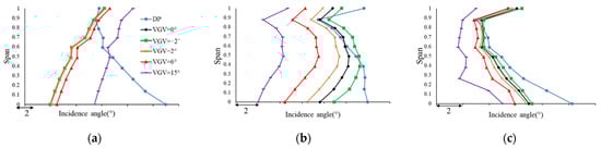 VGV1 adjustment when was still analyzed as a representative. , ,,, and were selected as negative angle, original angle, small angle, optimal angle, and large angle, respectively. At the same time, since blades of the compressor will be in the best state when operating at design point (DP), the distribution of incidence at design point was added, which is regarded as the optimal incidence of the blades. Figure 17 shows the incidence variation. It was found that as the VGV1 turning angle increases, the incidence of R1 moves to positive incidence, S1 and R2 move to negative incidence, and the change of the incidence of each row of cascades shows a translation trend. As VGV1 turning angle increases, the spanwise distribution of incidence of R1 is closer to the incidence of design point. The incidence characteristic is improved, which is beneficial to the improvement of the efficiency of R1. However, the incidence characteristics of S1 and R2 deteriorate, increasing the loss of S1 and reducing the efficiency of R2. In addition, the incidence of S1 and R2 may increase to the stall range of positive and negative incidence, resulting in a mismatch between stages and a sharp drop in efficiency.