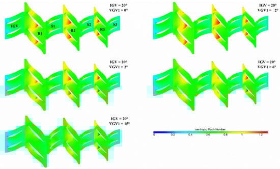 The isentropic Mach number distribution at 50% span of different VGV1 turning angles is shown in Figure 19. The peak Mach number of the rotors in first three stages are all larger than 1, and a strong shock wave occurs, which causes the interaction between the shock wave and boundary layer, resulting in a large shock wave loss. Due to the IGV opening degree being closed, the shock wave position of R1 moves to trailing edge, and the shock wave intensity is weaker than that of R2. As the VGV1 turning angle gradually increases from to , the peak Mach number in both R1 and R2 is significantly reduced, and the shock loss will also be reduced.