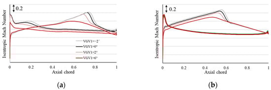 Isentropic Mach number distribution at 50% span (VGV1 adjustment). (a) R1; (b) R2.