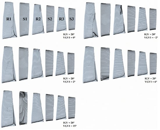 Limited streamlines on blade surfaces of first three stages (VGV1 adjustment).
