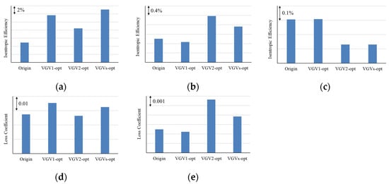 The original cases, the optimal turning angles of single VGV adjustments, and the optimal turning angles of VGV joint adjustment, which were named as origin, VGV1-opt, VGV2-opt, and VGVs-opt, respectively, were compared to analyze the impact of VGV joint adjustment on performance. The efficiency of R1, R2, and R3, and the total pressure loss S1 and S2, are shown in Figure 23. Compared with the original, VGV1-opt improves the efficiency of R1, increases the total pressure loss of S1, and reduces the efficiency of R2. VGV2-opt improves R1 and R2 efficiency, reduces R3 efficiency, reduces S1 total pressure loss but increases S2 total pressure loss. VGVs-opt shows higher efficiency than VGV1-opt and VGV2-opt at R1 and R2 efficiency, while S1 and S2 total pressure loss are near the average values of VGV1-opt and VGV2-opt, and R3 efficiency is the same as the VGV2-opt results. The efficiency of VGVs-opt appears as the additive effect of VGV1-opt and VGV2-opt efficiencies.