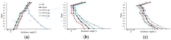 The incidence spanwise distribution of R1, R2, and R3, and the total pressure loss S1 and S2, are shown in Figure 24. Likewise, the incidence changes of VGVs-opt appear as the additive effect of those of VGV1-opt and VGV2-opt. The incidence movement towards positive angle of R1 for VGVs-opt is larger than those of VGV1-opt and VGV2-opt. R2 coincides with the original, which is near the average value of VGV1-opt and VGV2-opt. R3 is consistent with the result of VGV2-opt. The loss of S1 is near the average of VGV1-opt and VGV2-opt. S2 is consistent with VGV2-opt.