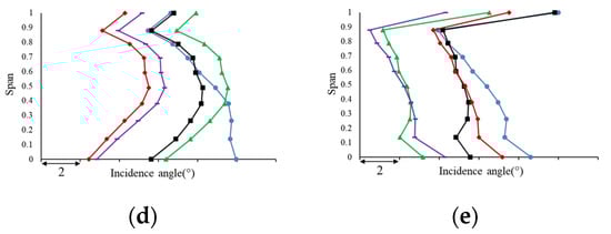 Incidence spanwise distribution (VGV joint adjustment). (a) R1; (b) R2; (c) R3; (d) S1; (e) S2.