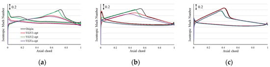 Isentropic Mach number distribution (VGV joint adjustment). (a) R1; (b) R2; (c) R3.