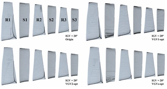 The isentropic Mach number distribution of the first three rotors, R1, R2, and R3, is shown in Figure 25. The R1 and R2 peak Mach numbers of VGVs-opt are lower than those of VGV1-opt and VGV2-opt. R3 coincided with VGV2-opt. Correspondingly, the limited streamlines on rotor suction surfaces and stator pressure surfaces of the first three stages are presented in Figure 26. The separation of R1 and R2 of VGV1-opt is improved, but the flow on the pressure surface of S1 is separated. The separation of R1 and R2 of VGV2-opt is also improved, and the flow fields of S1 and S2 do not change significantly. The flow fields on R1 and S1 of VGVs-opt are mainly consistent with VGV1-opt, and the R2 and S2 flow fields are mainly consistent with VGV2-opt. The shock wave structure and the boundary layer separation of VGVs-opt are also the superposition of the VGV1-opt and VGV2-opt.