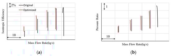 Performance curves of original compressor and compressor after VGV joint adjustment optimization. (a) Efficiency; (b) pressure ratio.