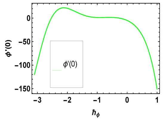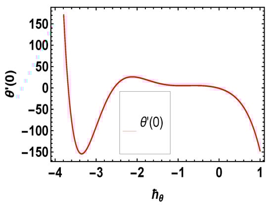 Here, in this section, we shall discuss the convergence of the above-derived solution. The analytical solution includes the convergence control parameter ℏ, which can affect the rate of approximation and the converging regions for the HAM solutions. The constant ℏ curve is quite rational whenever convergence takes place at p = 1. The convergence of Equations (41)–(43) is completely particularized by the secondary restriction , , and . There was a choice to control the series solutions and achieve their convergence. The probabilities of ℏ are represented by the ℏ curve for the fifth-order computed HAM solution. The efficient regions of ℏ are −2.0 1.0, −4.0 1.0 and −3.0 1.0. The convergence of the homotopy analysis method by the ℏ curve was employed for , and , as demonstrated in Figure 2, Figure 3 and Figure 4.