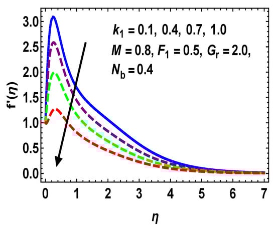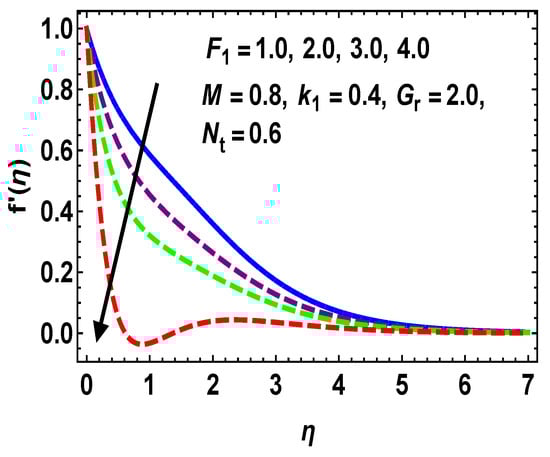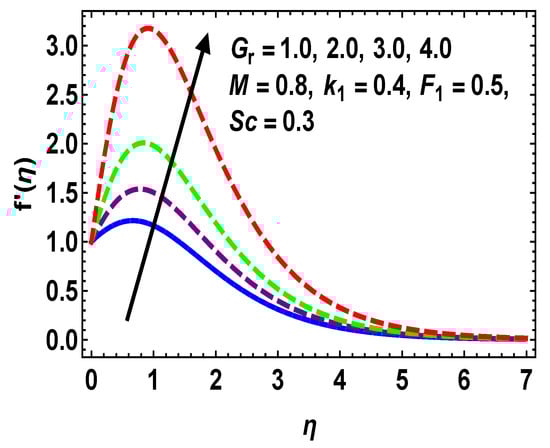 The important characteristics of the flow profile are graphically displayed in this subsection for certain embedded parameters, such as the magnetic parameter, the inertial parameter, the porosity parameter, and the Grashof number. Figure 5, Figure 6, Figure 7 and Figure 8 represent the impact of , which is displayed, respectively, for varying rates of M, , , and . Figure 5 characterizes the results of for the dissimilar rate of M when = 2.0, = 0.4, and = 0.5. From this graph, we predict that is dropped with the rising of M. Physically, the magnetic effects create drag forces, which produce resistance and can slow down the fluid motion, thereby reducing . Figure 6 characterizes the result of for the dissimilar rate of when = 2.0, = 0.6, = 0.4, and M = 0.8. It can be observed from Figure 6 that the curves are reduced against the rising of the values of . The inertial factor is directly proportional to the drag coefficient and porous medium. Thus, for high values of , both the drag coefficients and porosity of the medium rise. Consequently, a resisting force is boosted and, therefore, lower velocity is obtained, corresponding to bigger values of . Figure 7 depicts the variations of for various values of when = 2.0, = 0.4, = 0.5, and M = 0.8. This curve shows that decreases for some rising values of . Porous medium boosted the resistance to the fluid motion. Since the free convection Reynolds number is not an independent parameter and the heat transfer coefficients are small, a new dimensionless grouping of the Grashof number plays an important role, which incorporates the coefficients of the thermal expansion in the formulation. Figure 8 depicts the behavior of for varying values of when = 0.4, = 0.3, = 0.5, and M = 0.8. This figure shows that increases for larger rates of . The Grashof number is a measurement of the ratio of the buoyancy force to the viscous force operating on the fluid.